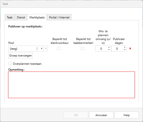 Wilt u dat alleen resources uit een bepaalde planningpool de dienst te zien krijgen en zich kunnen aanmelden, selecteer deze planningpool dan in dit veld.