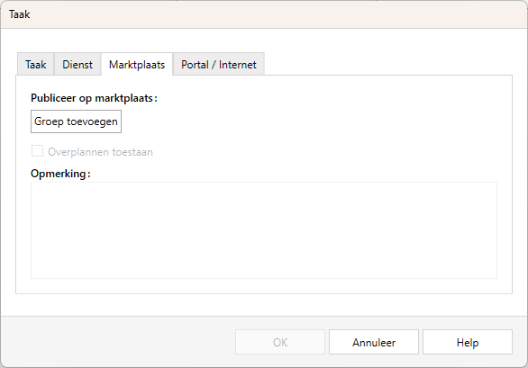 Als u de dienst publiceert op de marktplaats, moet u verplicht een opmerking invullen. Als de dienst wordt getoond in de agenda van de resource, is deze opmerking zichtbaar.