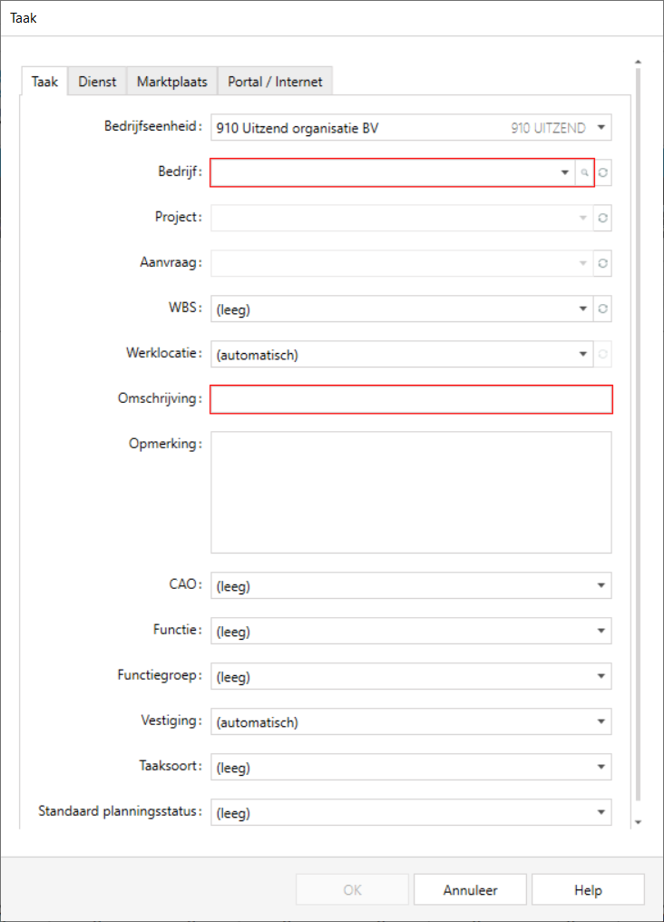 De pagina Taak opent. De roodomrande velden zijn verplicht om een planningtaak aan te maken. De knop OK is pas actief als de rode velden ingevuld zijn.