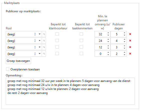 Per groep kunt u het publicatiemoment bepalen, dat wil zeggen hoeveel dagen voor aanvang de dienst zichtbaar wordt voor de betreffende groep. De standaardwaarde is 0. Dit betekent dat de dienst zichtbaar is op de marktplaats (voor alle dagen die van toepassing zijn), afhankelijk van de instelling in het veld PlannedTaskFrozenDays op de controllerinstantiekaart voor Agenda. Zie PlannedTaskFrozenDays en Controllersoort Agenda.