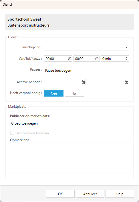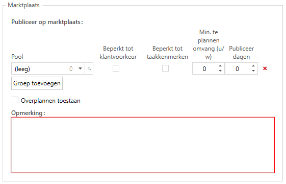 Als u de dienst publiceert op de marktplaats, moet u verplicht een opmerking invullen. Als de dienst wordt getoond in de agenda van de resource, is deze opmerking zichtbaar.