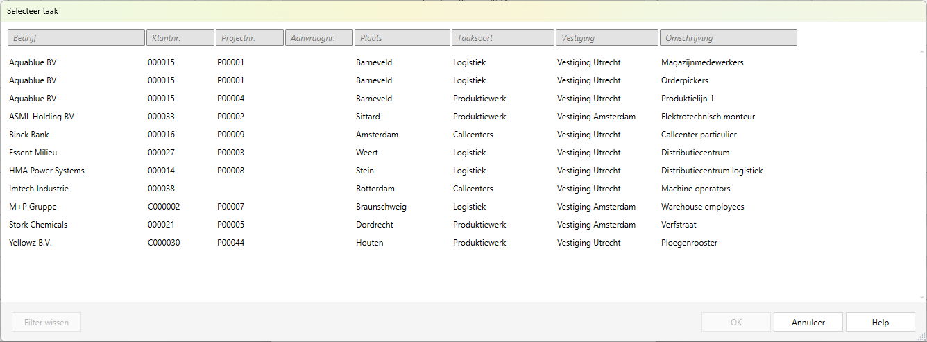 Pagina Taak selecteren (Planningmodule)