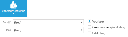 Bij een resource kan worden vastgelegd dat een bedrijf voorkeur heeft voor de resource of de resource juist wilt uitsluiten. Zie ook Pagina Planning uitsluiting / voorkeur. Via deze knop kunt u hierop filteren. Klik op de knop om de gewenste filtering in te stellen. Wilt u alleen resources zien waar een voorkeur voor is ingesteld, schakel dan de optie Voorkeur in. Wilt u alleen resources zien waar een uitsluiting voor is ingesteld, schakel dan de optie Uitsluiting in. Wilt u resources zien waarvoor geen voorkeur of uitsluiting is ingesteld, schakel dan de optie Geen voorkeur/uitsluiting in. U kunt ook meerdere opties inschakelen. Desgewenst kunt u ook een bedrijf en taak kiezen om specifieker te filteren. Er zijn 3 situaties mogelijk: