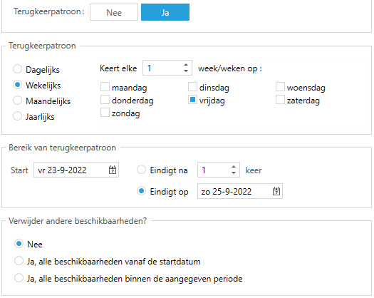 Standaard wordt de beschikbaarheid alleen ingepland op de geselecteerde dag (of op 2 dagen voor in totaal maximaal 24 uur). Het is mogelijk om dit voor een langere periode te herhalen door een terugkeerpatroon in te stellen. Klik daarvoor bij Terugkeerpatroon op Ja en stel het gewenste terugkeerpatroon in.