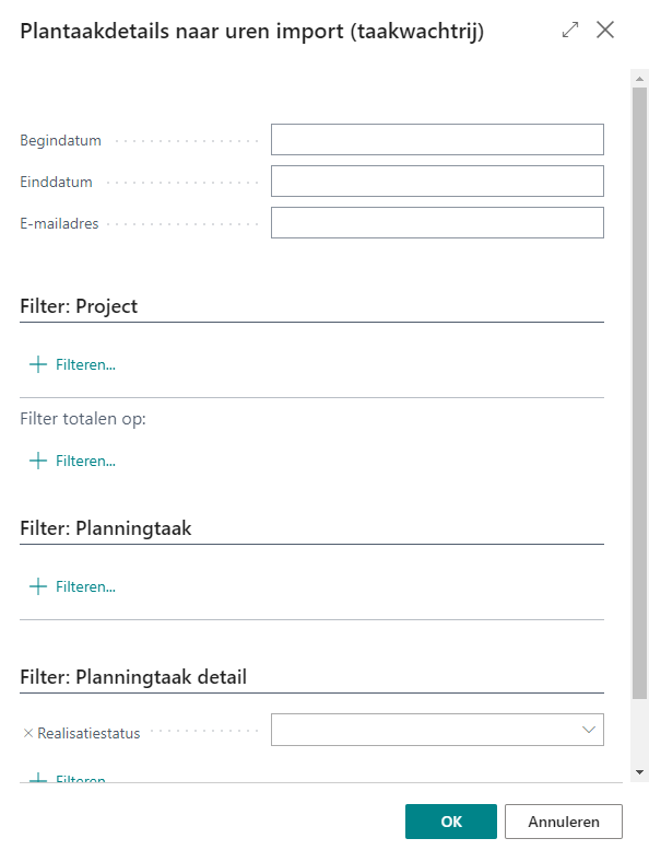 Het is belangrijk om in de rapportaanvraagpagina een filter te zetten op het veld Realisatiestatus onder Filter: Planningtaak detail. Als geen filter wordt ingesteld, dan wordt standaard op realisatiestatus Goedgekeurd gefilterd.