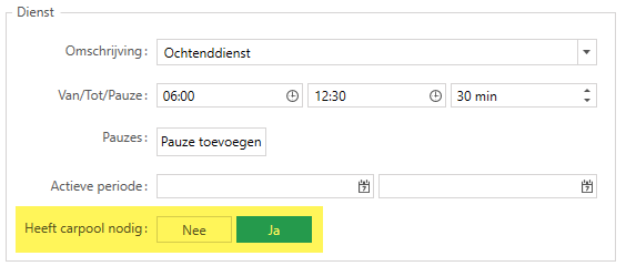 Op de dienst kan worden aangegeven of vervoer nodig is. Standaard staat het veld Heeft carpool nodig op Nee. Als Ja is ingesteld, wordt bij alle ingeplande resources op deze dienst (die niet zijn ingepland op/gekoppeld aan een auto) aangegeven dat ze vervoer nodig hebben via carpooling. Achter elke geplande resource die niet is ingepland op/gekoppeld aan een auto en die nog niet is ingepland als passagier is dan het icoon