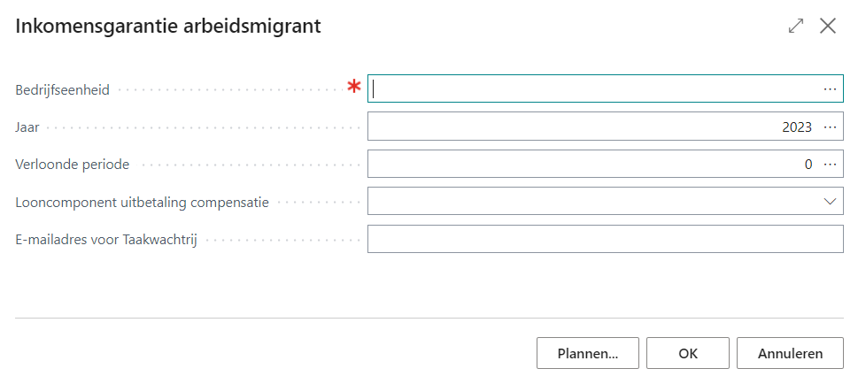 Resources die binnen de uitzendonderneming onder de criteria voor een inkomensgarantie voor een arbeidsmigrant vallen, moeten zijn geregistreerd. Dit kunt u vastleggen op de pagina Inkomensgarantie arbeidsmigrant van de resource. Zie Pagina Inkomensgarantie arbeidsmigrant.
