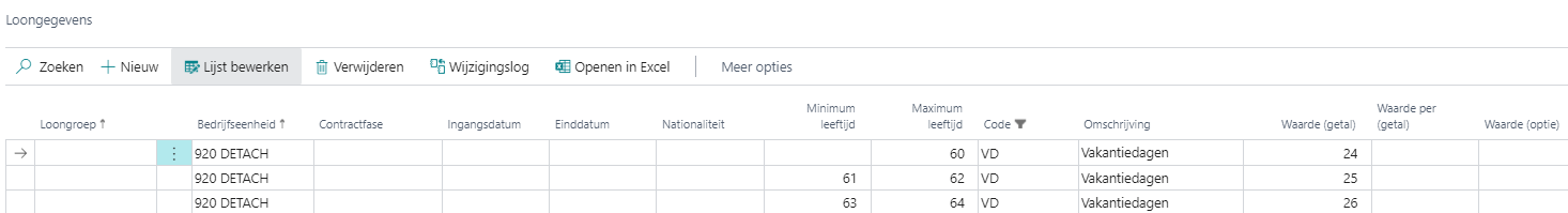 In dit voorbeeld is het aantal verlofdagen afhankelijk van de leeftijd. Op welk moment de leeftijd moet worden bepaald, kunt u instellen via het veld Leeftijdbepalingsmethode op de pagina Verlofsoorten per bedrijfseenheid. Zie Veld Leeftijdbepalingsmethode.