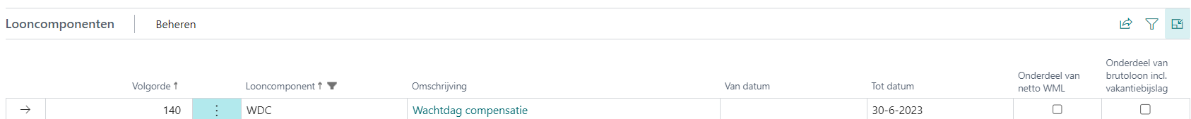 Voorbeeld: In de cao voor uitzendkrachten is het aantal wachtdagen per 1-7-2023 gewijzigd van 2 naar 1. Daarom is de wachtdagcompensatie per 1-7-2023 vervallen. In elke looncomponentset met looncomponent WDC is automatisch in het veld Tot datum de datum 30-6-2023 ingevuld.