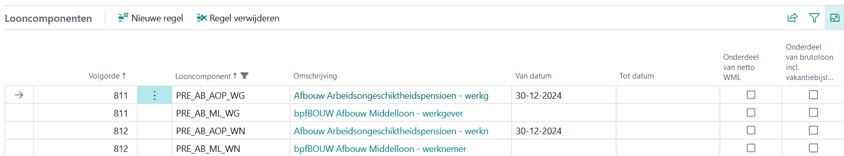 De APG Afbouwpensioenaangifte is per 2025 uitgebreid met de arbeidsongeschiktheidspensioenregeling voor de cao Afbouw (02). De ingangsdatum bij de premielooncomponenten PRE_AB_AOP_WG en PRE_AB_AOP_WN moet daarom 30-12-2024 zijn.
