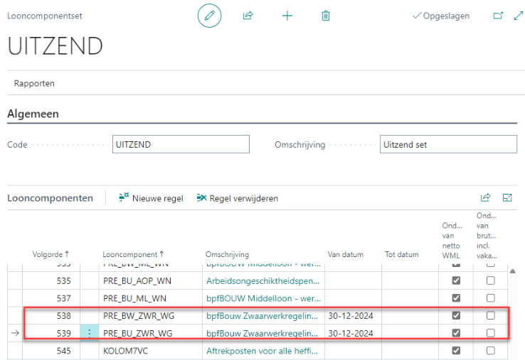 De APG Bouwpensioenaangifte is per 2025 uitgebreid met de Zwaarwerkregeling voor de cao Pensioen Bouw (92) en de cao Regeling pensioen UTA Bouw (17). De ingangsdatum bij de premielooncomponenten PRE_BW_ZWR_WG en PRE_BU_ZWR_WG moet daarom 30-12-2024 zijn.