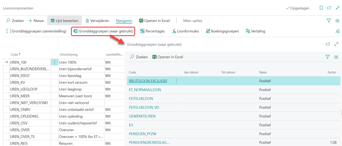 Via de knop Grondslaggroepen (waar gebruikt) kunt u zien in welke grondslaggroepen een looncomponent is opgenomen.