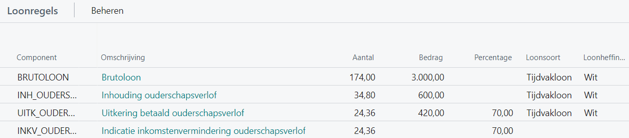 Voor de inrichting zie het pdf-document Werkinstructie Betaald ouderschapsverlof (scenario B Vast loon automatisch).