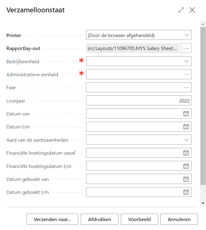 Vul altijd een bedrijfseenheid, administratieve eenheid en loonjaar in, dit zijn verplichte velden.