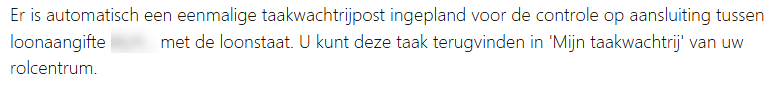 Als een loonaangifte wordt verzonden en de verzending naar Digipoort is gelukt, wordt automatisch een eenmalige taakwachtrijpost met rapport 11269515 aangemaakt. Als deze taakwachtrijpost is ingepland, krijgt u deze melding: