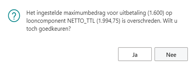 Als het loongegeven is ingesteld en een loonberekening bevat de looncomponent NETTO_TTL met een bedrag dat hoger is dan het ingestelde maximum, dan kan deze loonberekening niet worden goedgekeurd: