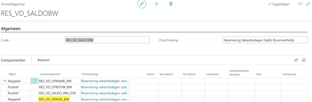 Zorg dat looncomponenten RES_VD_VERVAL_BW en RES_VD_VERVAL_W onderdeel worden van de grondslaggroepen van het betreffende saldo (W en BW).