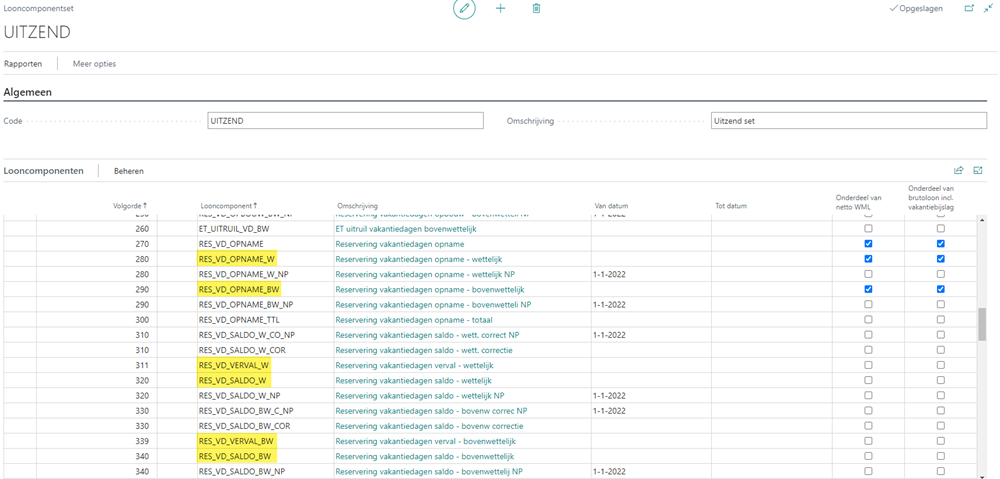 De looncomponenten RES_VD_VERVAL_BW en RES_VD_VERVAL_W moeten worden toegevoegd aan de betreffende looncomponentset(s). De volgorde is hierbij van belang.
