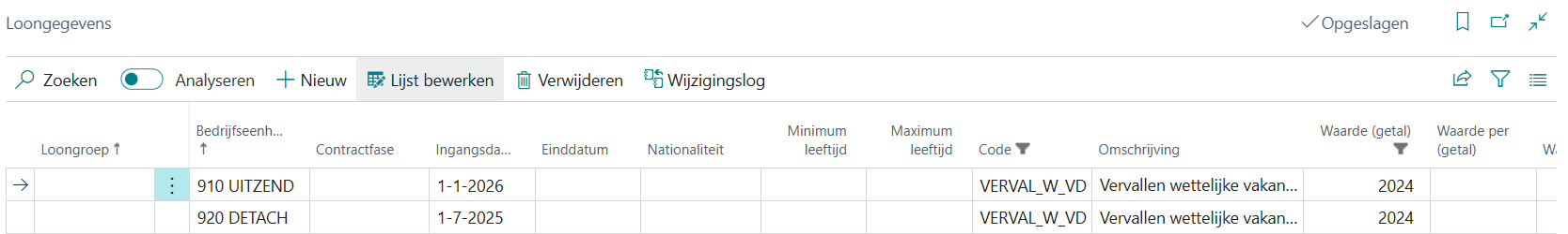 Uiteraard kunt u ook meerdere regels per loongegevenssoort vastleggen voor verschillende bedrijfseenheden als de vervaldata per bedrijfseenheid verschillen.