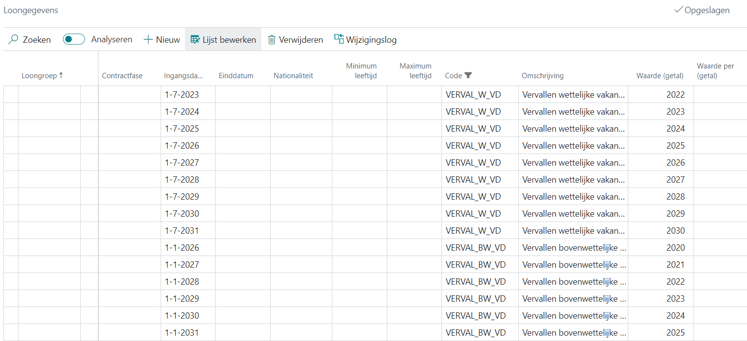 De loongegevenssoorten VERVAL_BW_VD en VERVAL_W_VD stelt u op de pagina Loongegevens in. Op de regel(s) met deze codes geeft u aan wanneer de niet opgenomen vakantiedagen moeten vervallen. Daartoe vult u in het veld Waarde (getal) het jaartal in en in het veld Ingangsdatum de datum waarop het niet opgenomen saldo van het ingestelde jaar vervalt. U kunt desgewenst al regels toevoegen voor toekomstige jaren of elk jaar een regel toevoegen.