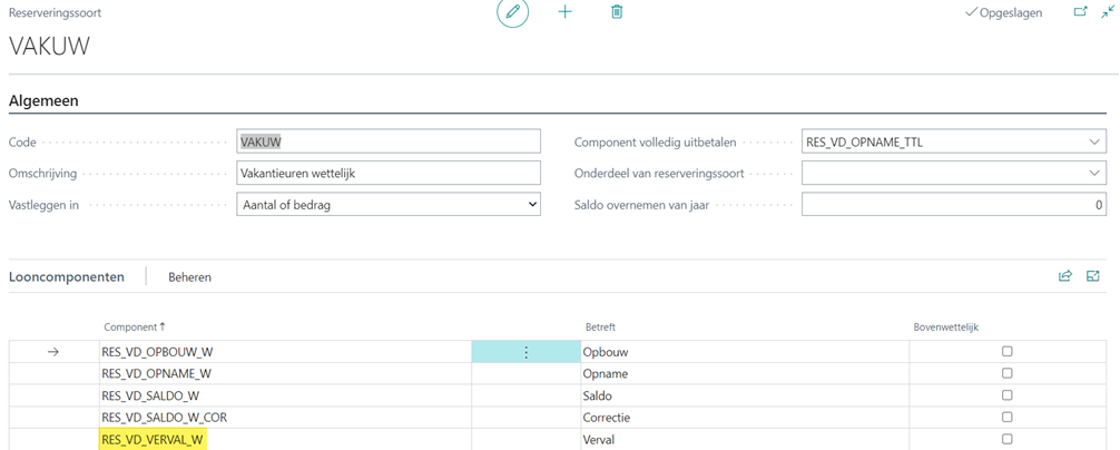 Voeg de looncomponenten RES_VD_VERVAL_BW en RES_VD_VERVAL_W toe aan de betreffende reserveringssoorten. Stel bij Betreft de waarde Verval in.
