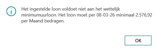Klikt u op de knop Controleer minimumloon en is het loon in de sneltab Loon hoger dan of gelijk aan het berekende minimumloon, dan krijgt u deze melding: