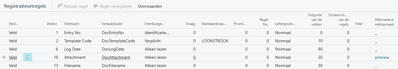 Klik in de regel met veldnr. 10 op het veld Alternatieve veldopmaak, waarmee pagina Registratieset veldopmaak opent. Stel in het veld Bestand de waarde Preview in.