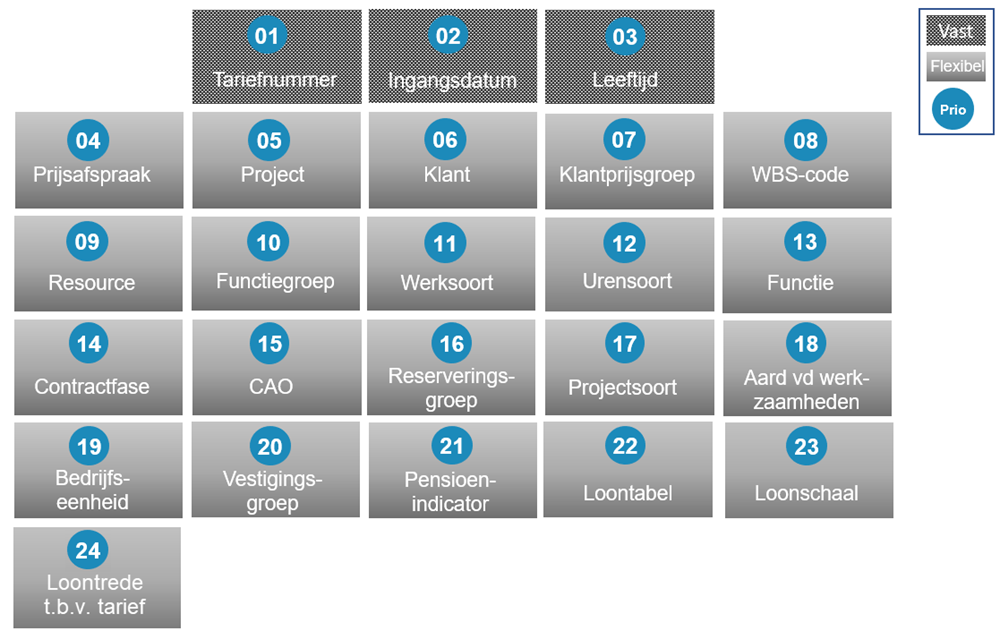Via flexibele indexen kan per centraal bedrijf worden ingericht welke loon- en tariefdoorsnijdingen gewenst zijn. Er is een flexibele index voor loon en een flexibele index voor tarief beschikbaar. Kies per index maximaal 17 doorsnijdingen (sleutelvelden), in een vaste volgorde. Hoewel er meer dan 17 sleutelvelden zijn, is het technisch niet mogelijk om ze allemaal te kiezen.