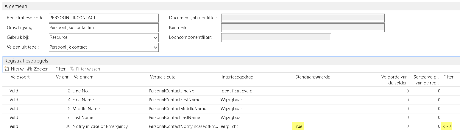 Als u inricht dat het mogelijk is om contactpersonen toe te voegen, inclusief de optie Waarschuwen bij calamiteiten, kunt u ook instellen dat deze optie standaard is ingeschakeld. Daarvoor vult u in het veld Standaardwaarde de waarde True in (dit is niet afhankelijk van de standaardtaal op de NAV server).