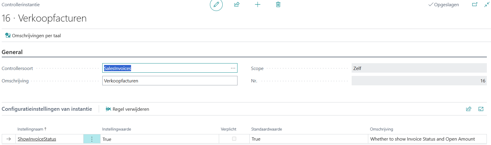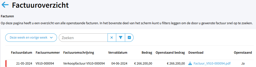 Via de controllersoort SalesInvoices is het mogelijk om verkoopfacturen op de portal te tonen. Het factuuroverzicht toont alle openstaande facturen plus de facturen die voldoen aan het ingestelde filter.
