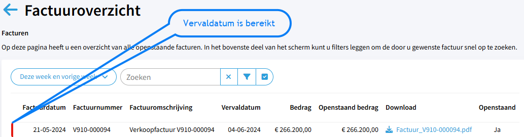 Regels met openstaande facturen waarvan de vervaldatum (op de peildatum) is bereikt, beginnen met een rode verticale lijn. Deze rode lijn is alleen zichtbaar als de kolommen Openstaand bedrag en Openstaand worden getoond.