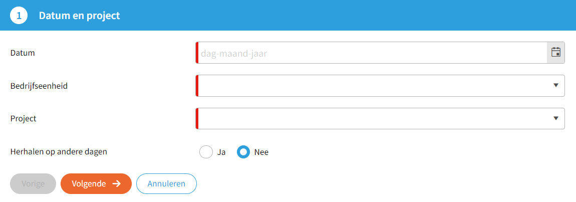 Standaard hoeft de resource alleen een datum in te voeren en, indien van toepassing, een keuze te maken voor een bedrijfseenheid en een project.