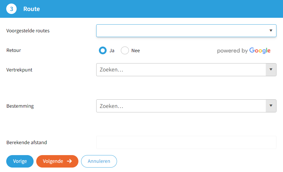 De resource kan ook adressen zoeken voor het vertrekpunt en de bestemming(en), als de Google Maps API is ingericht. De afstand wordt dan automatisch berekend. De berekening houdt rekening met de Google Maps modus die bij de gekozen vervoerwijze hoort (Auto, Fietsen of Lopen).