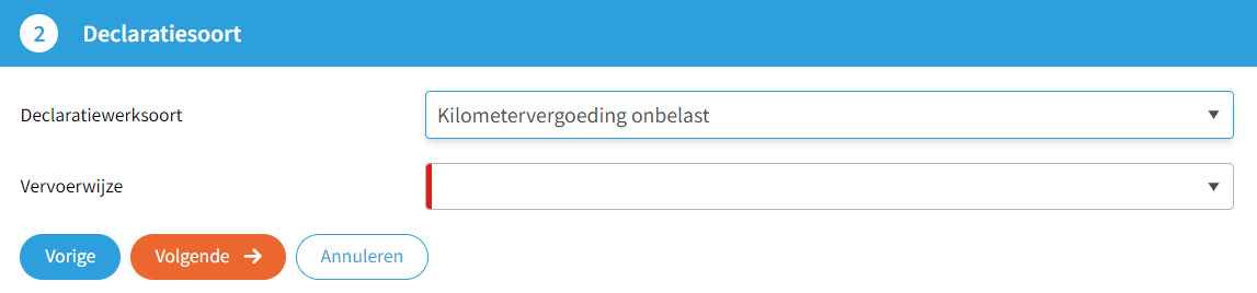Is aan het project 1 declaratiewerksoort (met indien van toepassing 1 vervoerwijze) gekoppeld, dan wordt deze stap overgeslagen.
