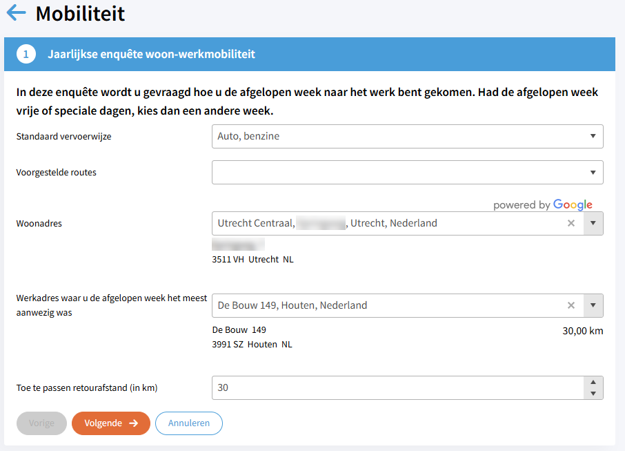 De berekende afstand tussen het woon- en werkadres is automatisch verdubbeld (dus heen en terug). Dat is nodig omdat voor de berekening van de jaarkilometers voor de Rapportageverplichting werkgebonden personenmobiliteit (WPM) de dubbele reisafstand nodig is. Zie ook de website van het RVO over de Rapportageverplichting werkgebonden personenmobiliteit.