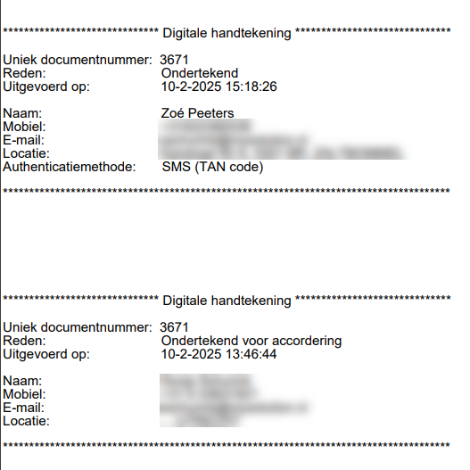 Bij deze manier van ondertekenen is tweefactorauthenticatie via sms van toepassing. De resource of contactpersoon die op de portal is ingelogd kan pas ondertekenen nadat hij/zij een verificatiecode heeft opgevraagd die per sms wordt verzonden.