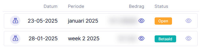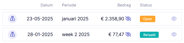 Het uit te betalen bedrag per loonstrook is standaard niet zichtbaar op de portal (omdat bij HideSalaryAmount de standaardwaarde op False staat). Staat de waarde in het veld Instellingwaarde op True, dan ziet de resource bij elke loonstrook een sterk vervaagd bedrag (zodat het niet zichtbaar is) en het icoon Voorbeeld: Bedrag niet zichtbaar
