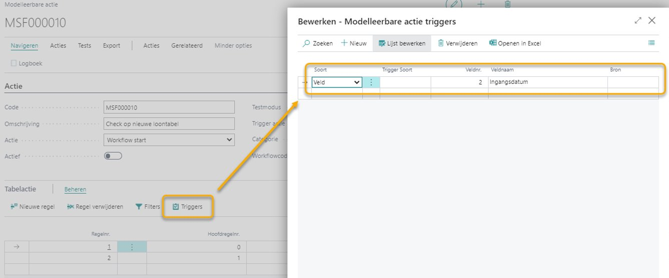 Selecteer deze regel en klik op de actiebalk van de sneltab op de knop Triggers. De pagina Modelleerbare actie triggers opent.