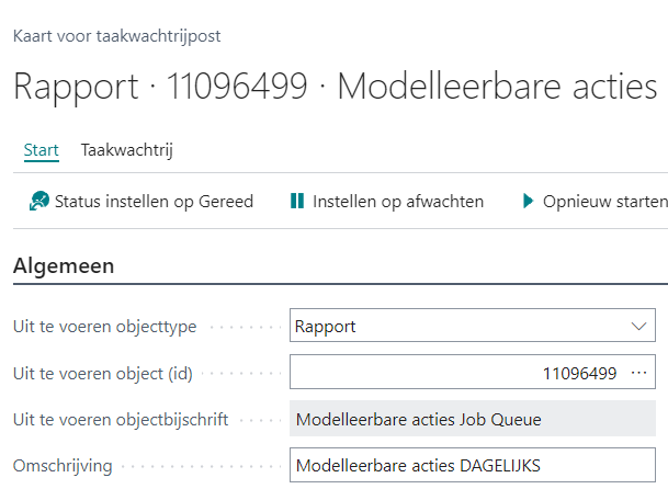 MA's die geen triggeractie bevatten kunt u starten via een taakwachtrijpost (met uitzondering van MA's met actie Overzicht filter). Maak daarvoor een taakwachtrijpost aan met rapport 11096499.
