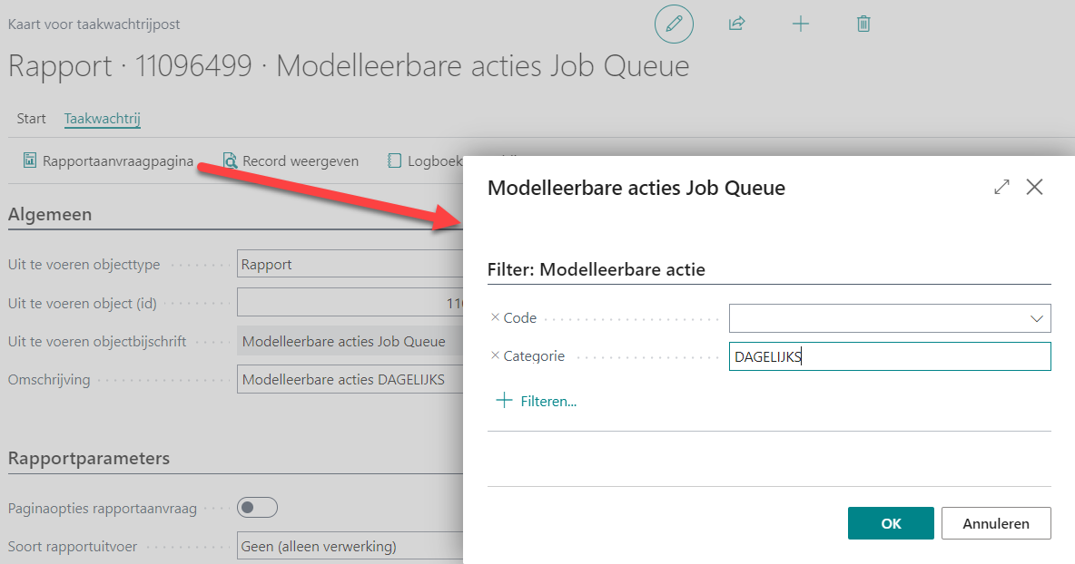 Stel vervolgens in de rapportaanvraagpagina van de taakwachtrijpost in het filterveld Categorie ook de waarde DAGELIJKS in.