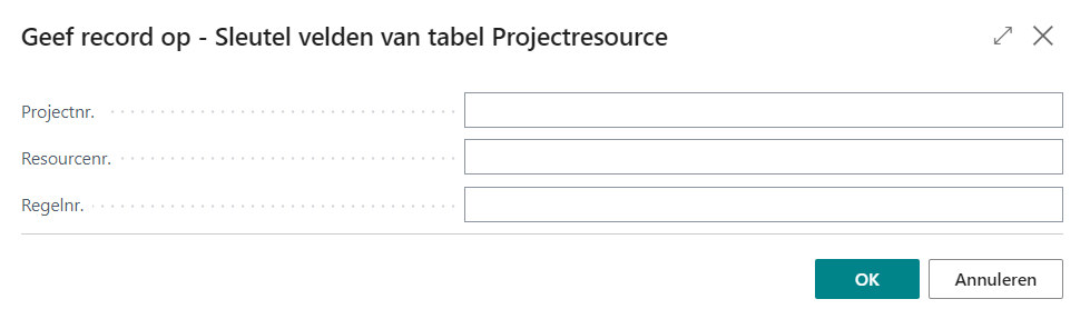 In geval van de projecresourcetabel geeft u een projectnummer, resourcenummer en regelnummer op.