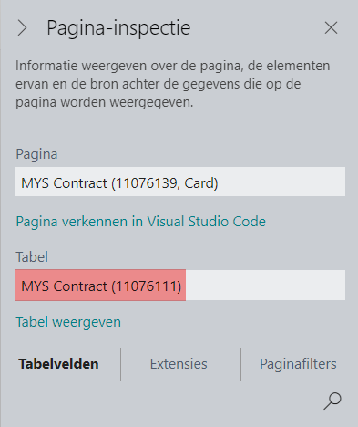 Voorbeeld: U navigeert naar de contractkaart en gebruikt de toetscombinatie Ctrl+Alt+F1. In Pagina-inspectie ziet u dan in het veld Tabel de naam en het nummer van de tabel staan.