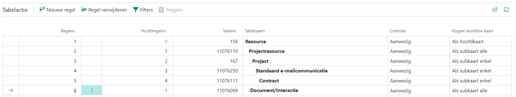 Als u de MA wilt laten starten via een trigger, selecteert u de eerste regel en klikt u op de knop Triggers. Zie ook Starten van een modelleerbare actie en Trigger instellen.