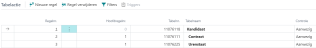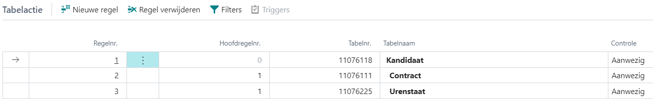- Voeg in de sneltab Tabelactie 3 tabelactieregels toe met bovenaan de tabel Kandidaat (11076118), daarna tabel Contract (11076111) en vervolgens tabel Urenstaat (11076225) toe. De kandidatentabel moet als bovenste tabelactie worden opgegeven omdat de MA op dat niveau gebruikt moet worden.