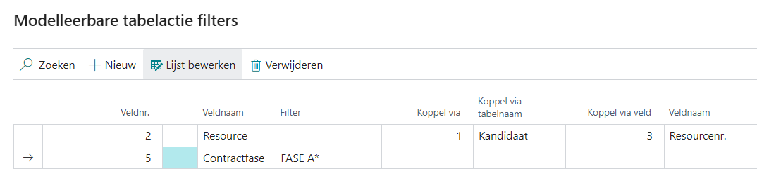 Zet daarnaast een filter op de contractfasecode die voor Fase A wordt gebruikt. In het voorbeeld is dat FASE A. Als er meerdere contractfasecodes zijn voor Fase A, moet u het filter uitbreiden. Bijvoorbeeld FASE A MUB|FASE A ZUB. Of FASE A*.