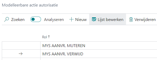 - Kies in de actiebalk van de pagina Modelleerbare actie scherm instellingen voor Navigeren > Rollen. Selecteer de machtigingensets die rechten geven om aanvragen te muteren.