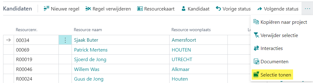In de sneltab Kandidaten van een aanvraag of zoekactie kunnen gebruikers met de geautoriseerde rol(len) klikken op de knop Selectie tonen en dan de MA selecteren en uitvoeren.