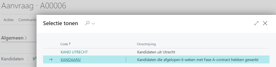 Stel, u wilt dat alleen gebruikers met muteerrechten op een aanvraag- of zoekactiekaart in de sneltab Kandidaten een selectie kunnen toepassen op kandidaten die de afgelopen 6 weken hebben gewerkt met een Fase A-contract. Daarvoor kunt u een modelleerbare actie (MA) inrichten. Hieronder volgt een voorbeeld hoe u dat kan doen (er zijn variaties mogelijk).